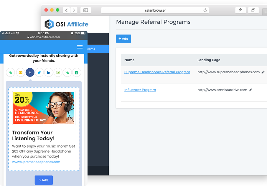 Every plan includes full integration with Facebook, Twitter and LinkedIn allowing your affiliates to easily share their link across multiple social networks.